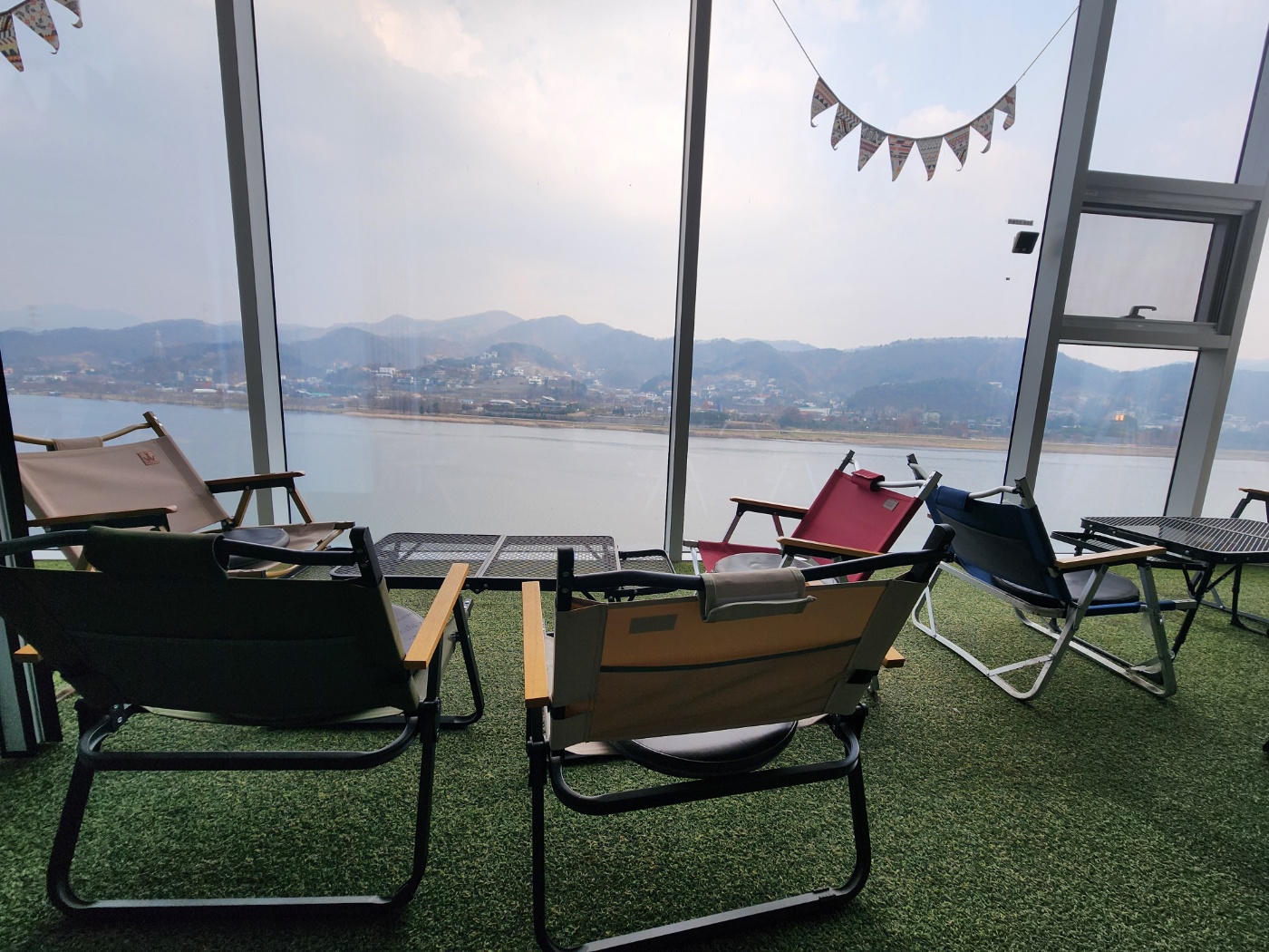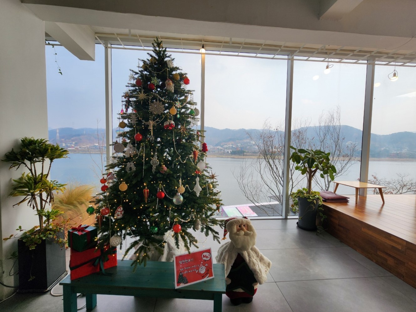 카페 문을 열고 들어서자 정면으로 보이는 트리, 그리고 창밖으로는 북한강이 보인다.